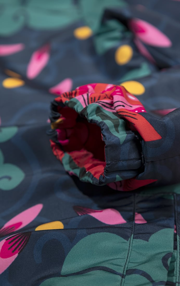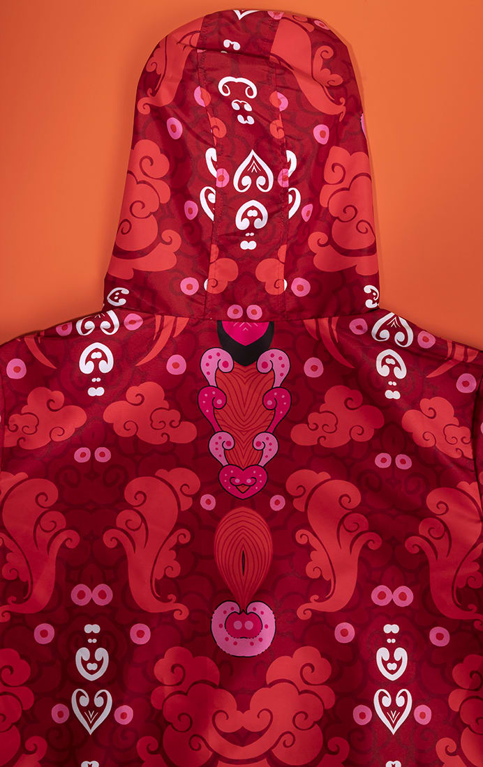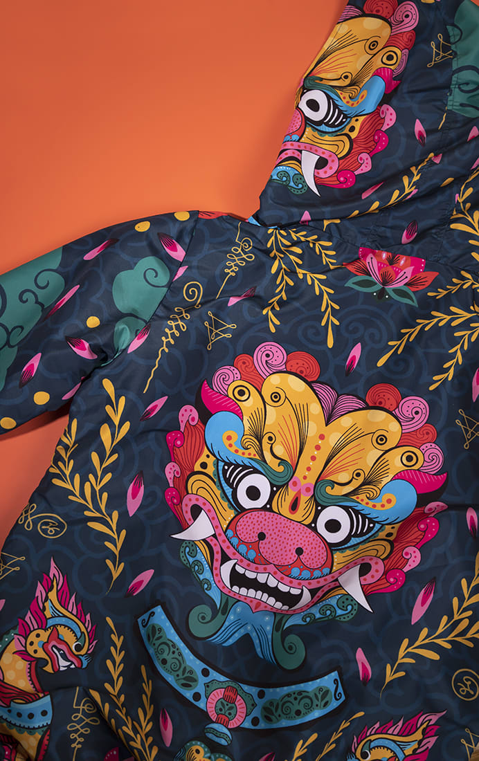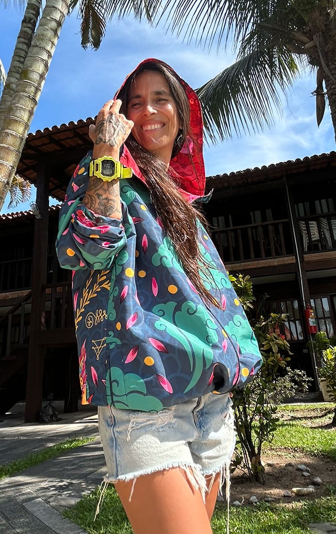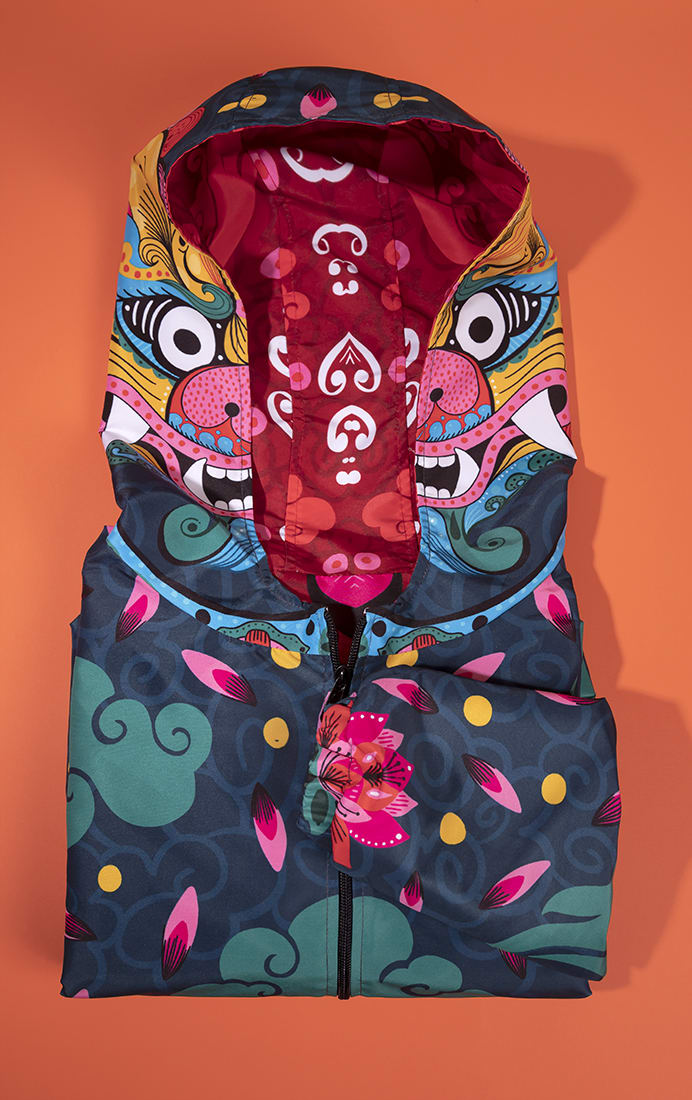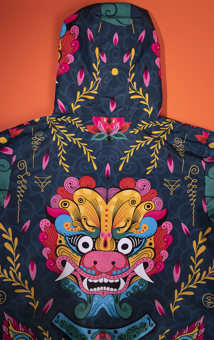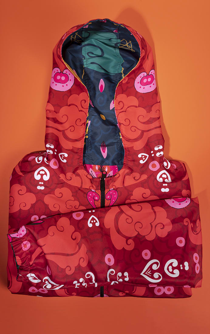 La propuesta gráfica viene de la mano de la artista chilena La Negra María, quien convierte este cortavientos en una pieza única y expresiva.