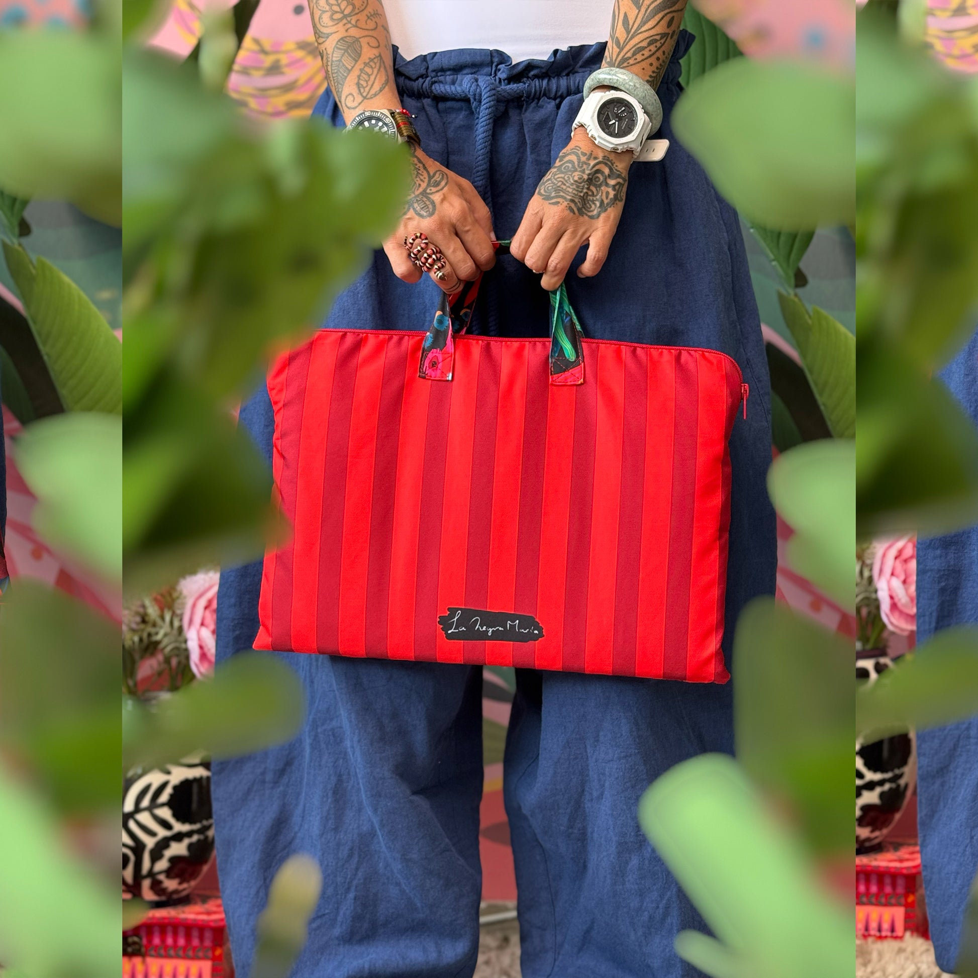 Confeccionado en lona impermeable, es un estuche acolchado, resistente y suave al tacto, pensado para proteger tu notebook sin perder ese toque artístico tan característico de La Negra María.