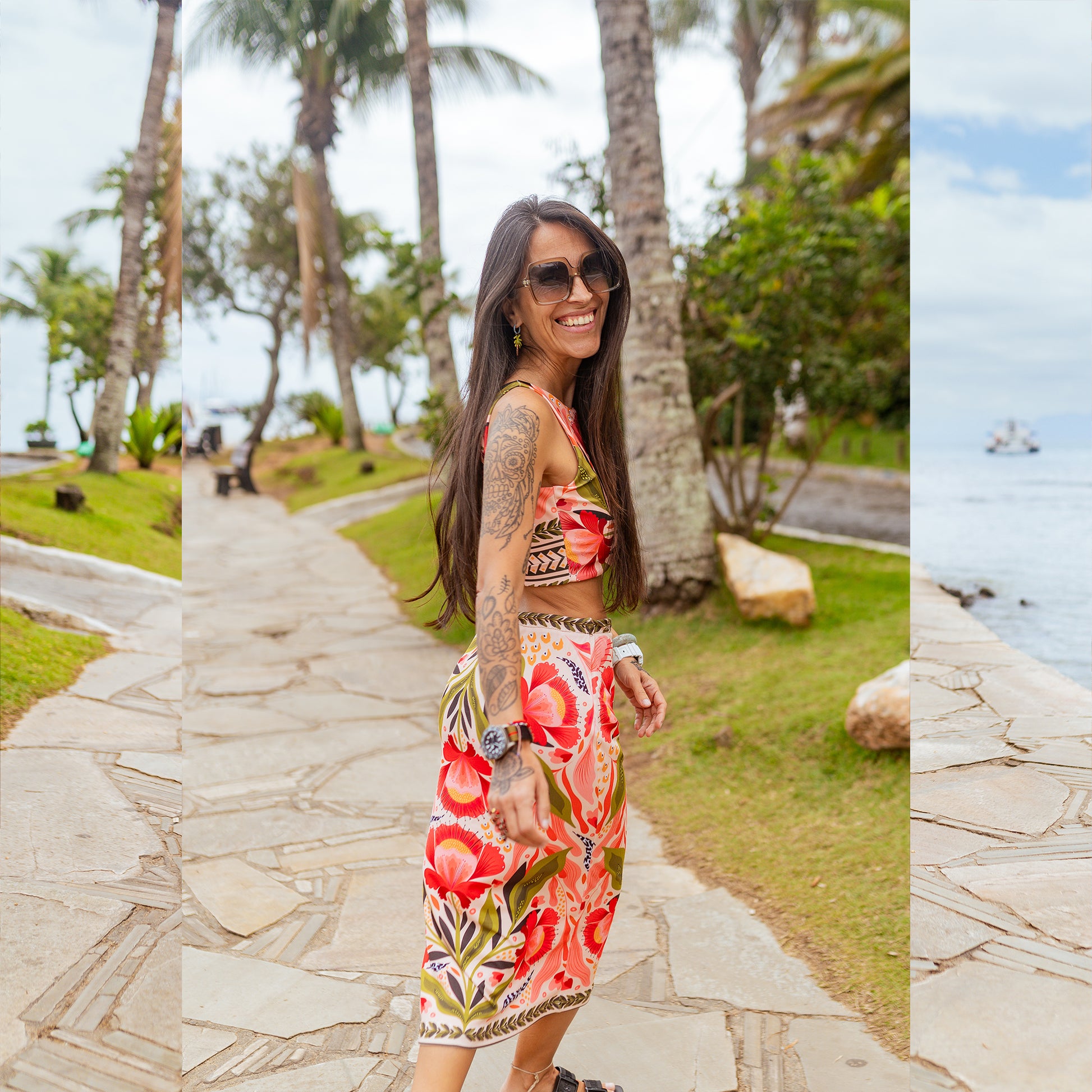 Completamente ilustrada, llena de color y flores grandes que le dan mucha personalidad, es de esas prendas que te levantan el ánimo apenas te la pones. La puedes usar con un top, un peto, una polera básica o incluso con traje de baño encima si estás de vacaciones. Se adapta a todo y se siente liviana y agradable para caminar, viajar o simplemente andar por la vida colorida.