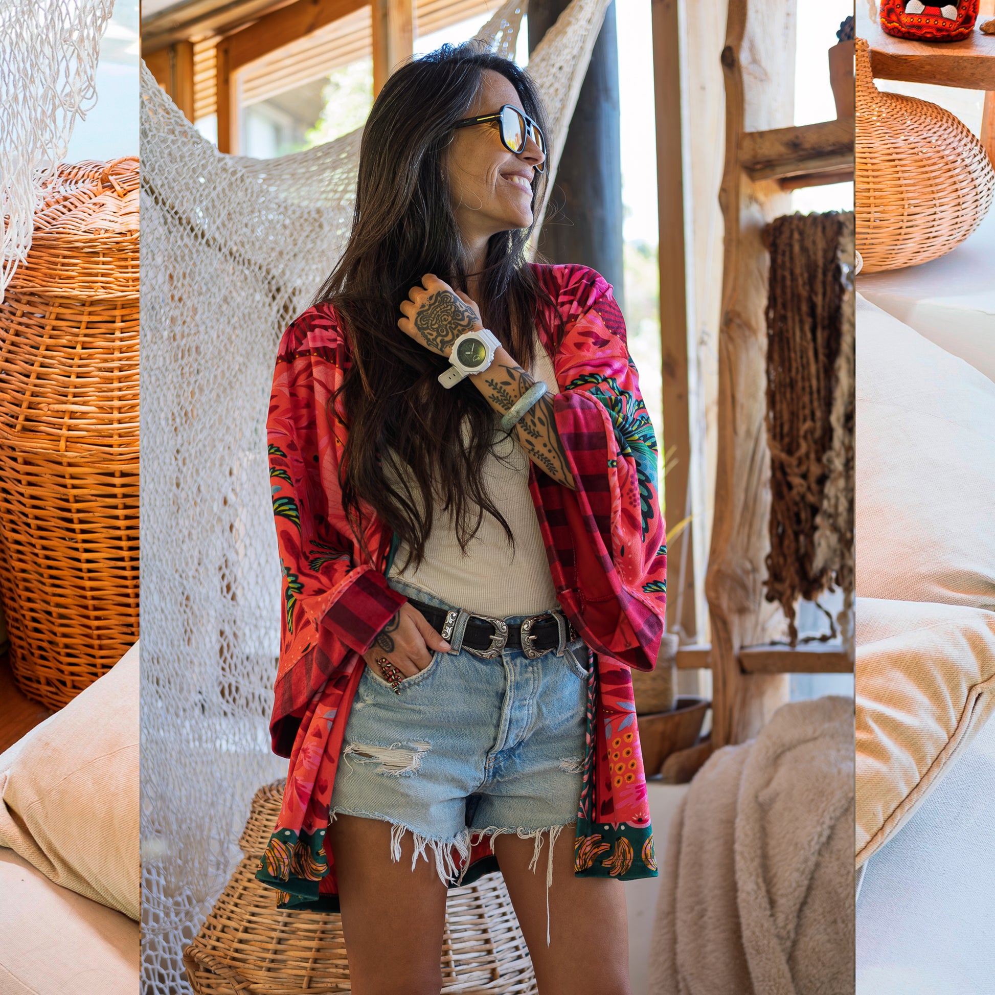 Está completamente ilustrado con una propuesta llena de flores, hojas y tonos vibrantes, muy en la onda alegre y luminosa de La Negra María. Es de esas prendas que te acompañan en todo: para usarlo sobre jeans, con shorts, con vestido, con traje de baño o incluso para estar en la casa sintiéndote linda igual.