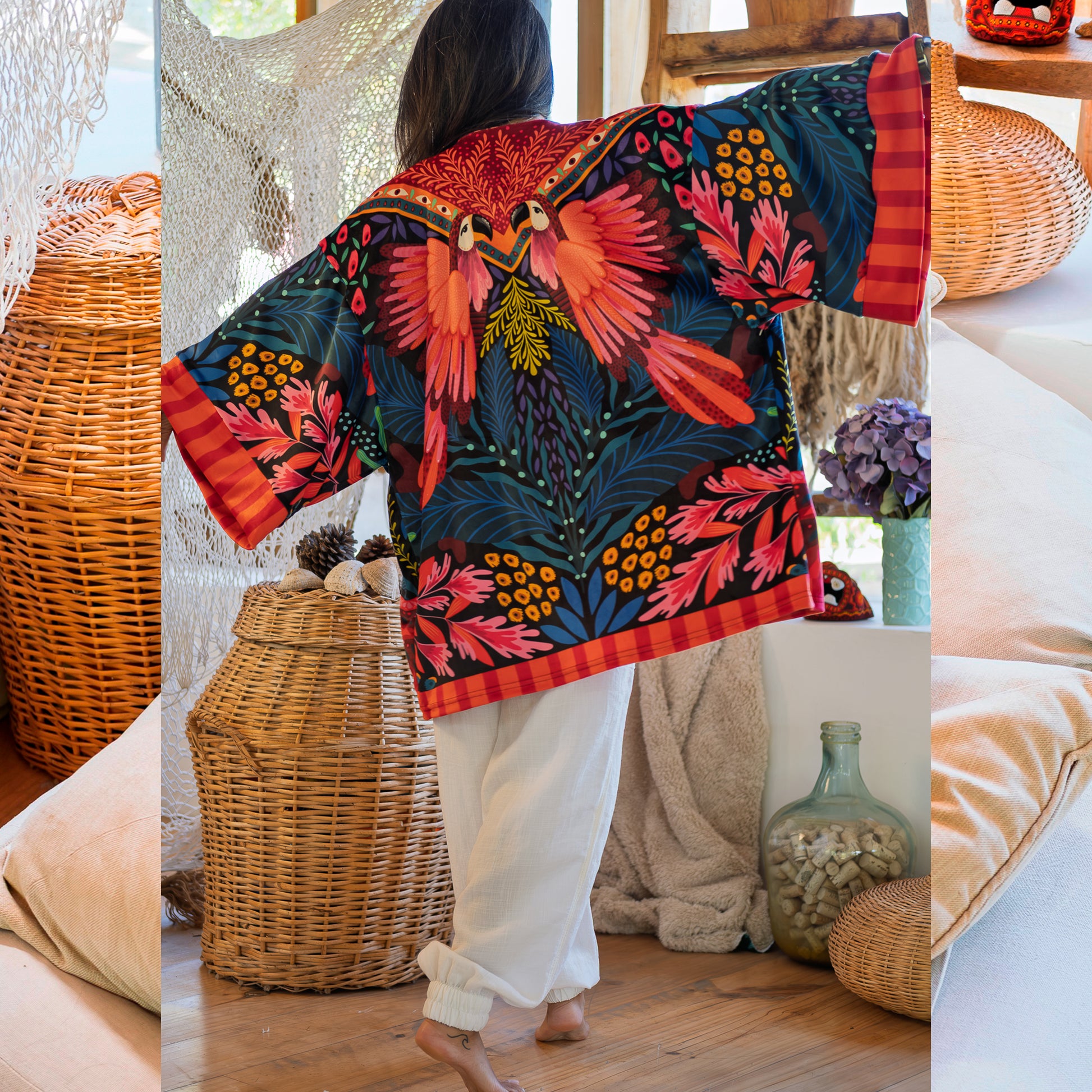 Está completamente ilustrado con una propuesta llena de flores, hojas y tonos vibrantes, muy en la onda alegre y luminosa de La Negra María. Es de esas prendas que te acompañan en todo: para usarlo sobre jeans, con shorts, con vestido, con traje de baño o incluso para estar en la casa sintiéndote linda igual.