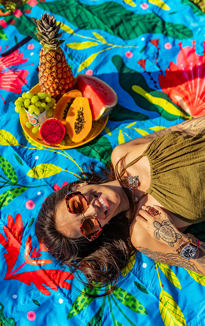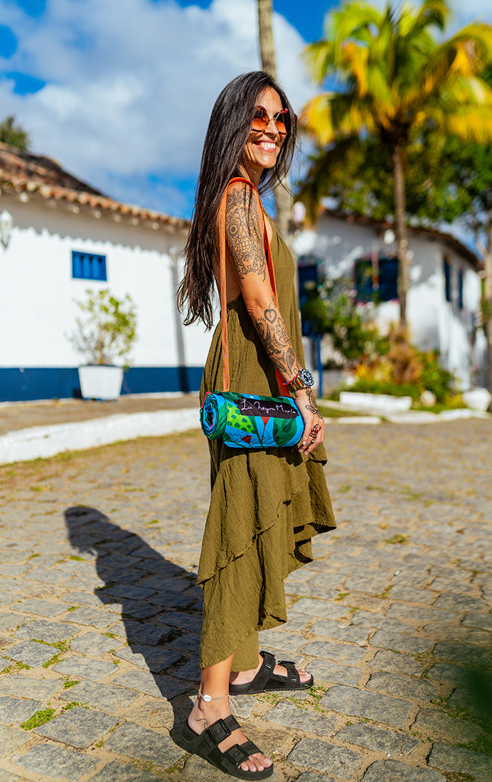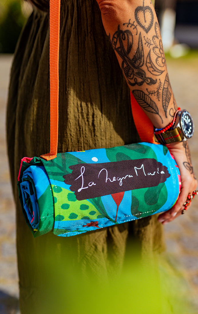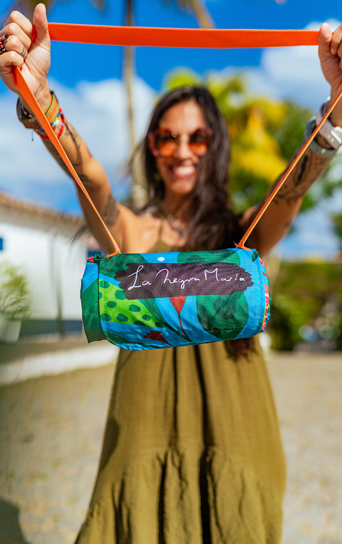 Esta mantita está elaborada en lona impermeable y con ilustraciones vibrantes en ambos lados que la hacen completamente reversible. Lo mejor de todo: cuenta con un ingenioso sistema de cierre que la transforma en un mini bolso súper práctico, ideal para que la lleves a donde quieras!