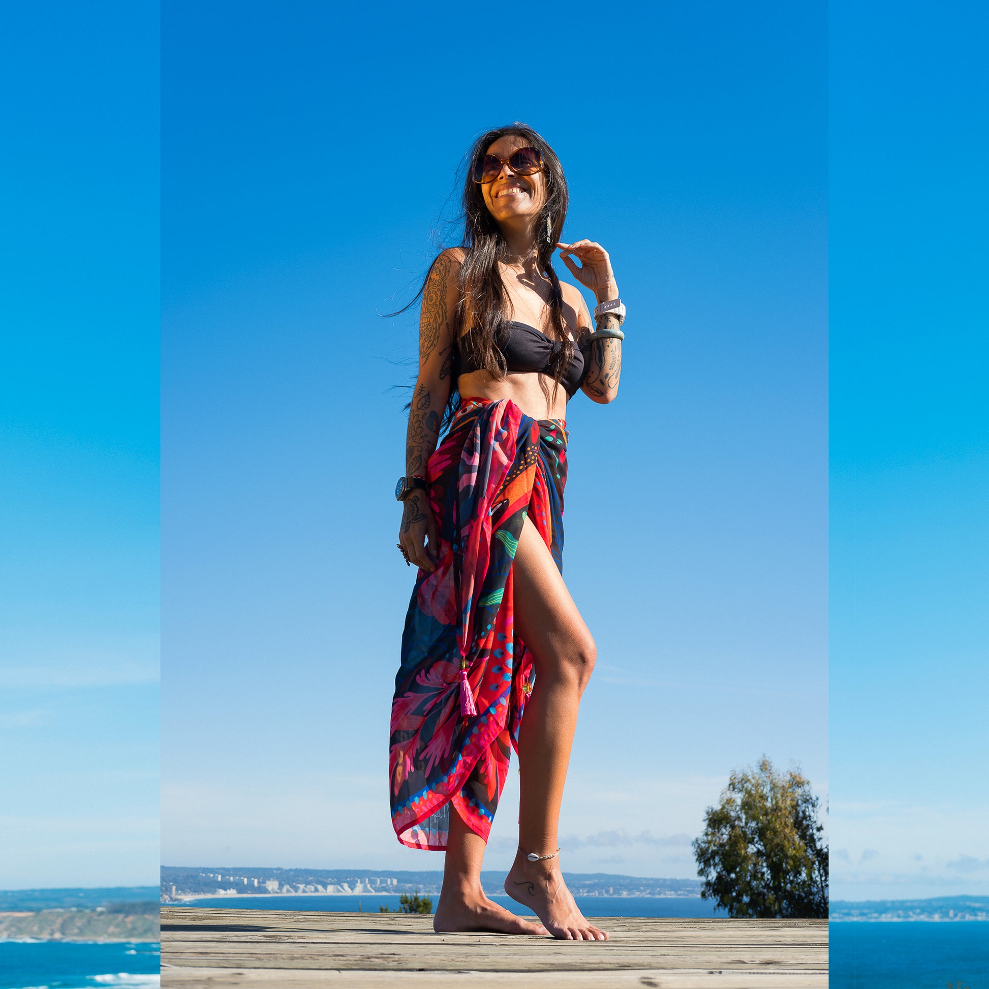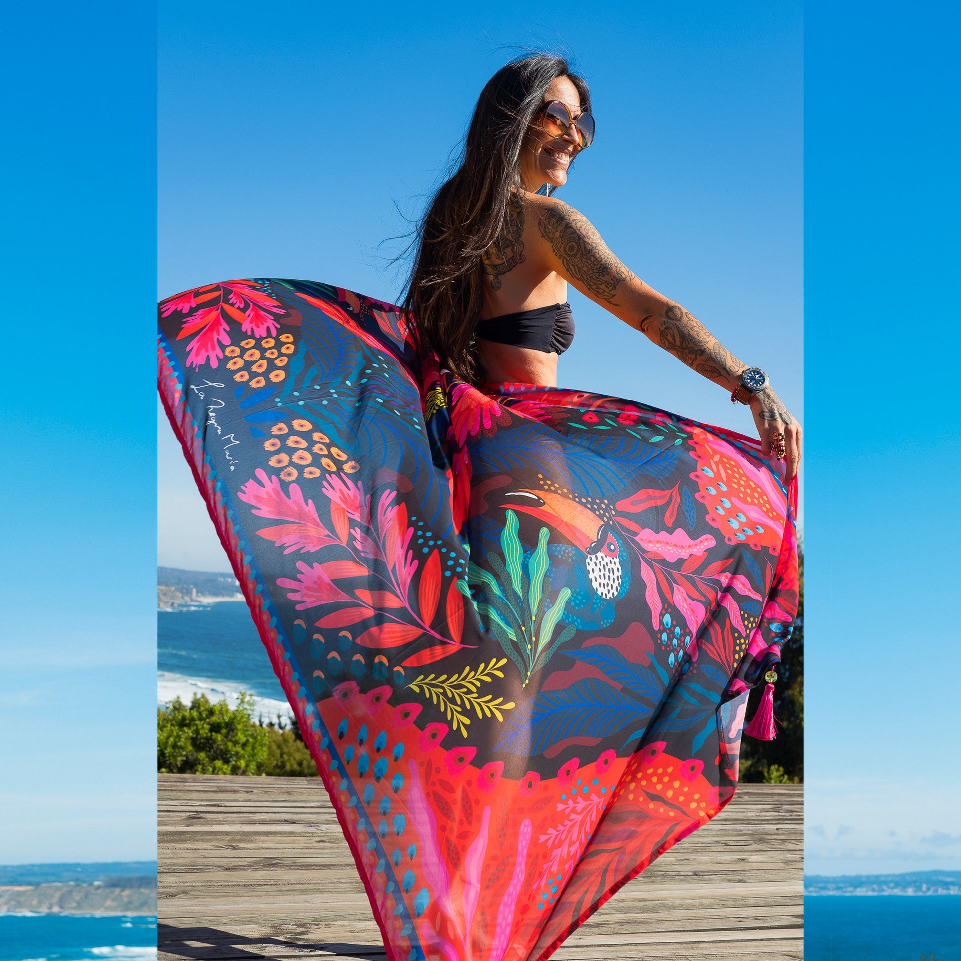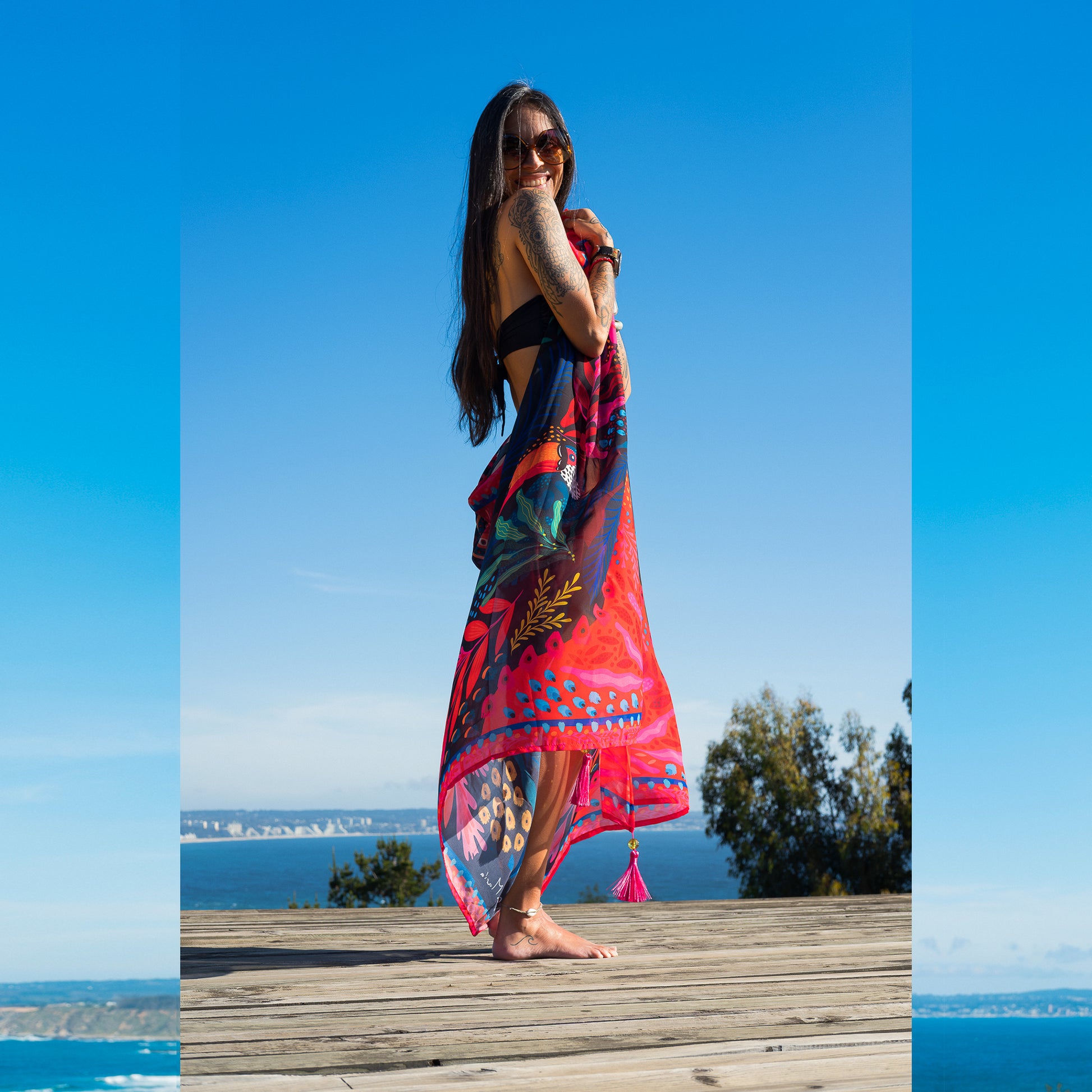 Está completamente ilustrado con diseño exclusivo de La Negra María, convirtiéndolo en una prenda que no solo viste, sino que también cuenta una historia de color y movimiento. Lo puedes usar sobre tu traje de baño, anudado a la cintura, como vestido, o bien sobre los hombros para darle un giro lleno de vida a cualquier outfit.