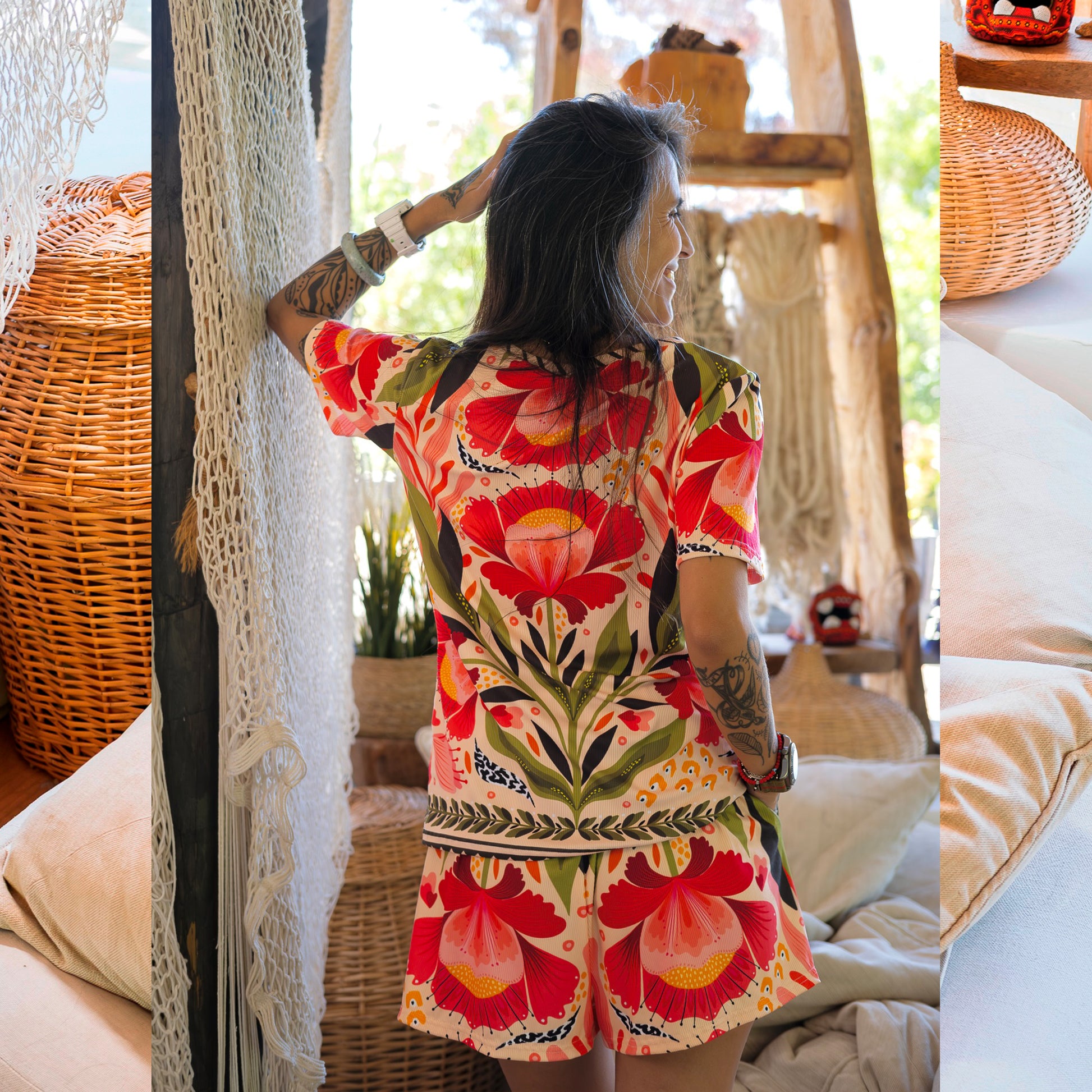 El verano pide color, alegría y frescura… y este pijama de dos piezas lo tiene TODO. Es un conjunto exquisito, compuesto por un short cómodo y una polera suelta, ambos completamente ilustrados con una explosión floral vibrante que es puro La Negra María: audaz, alegre y lleno de vida.