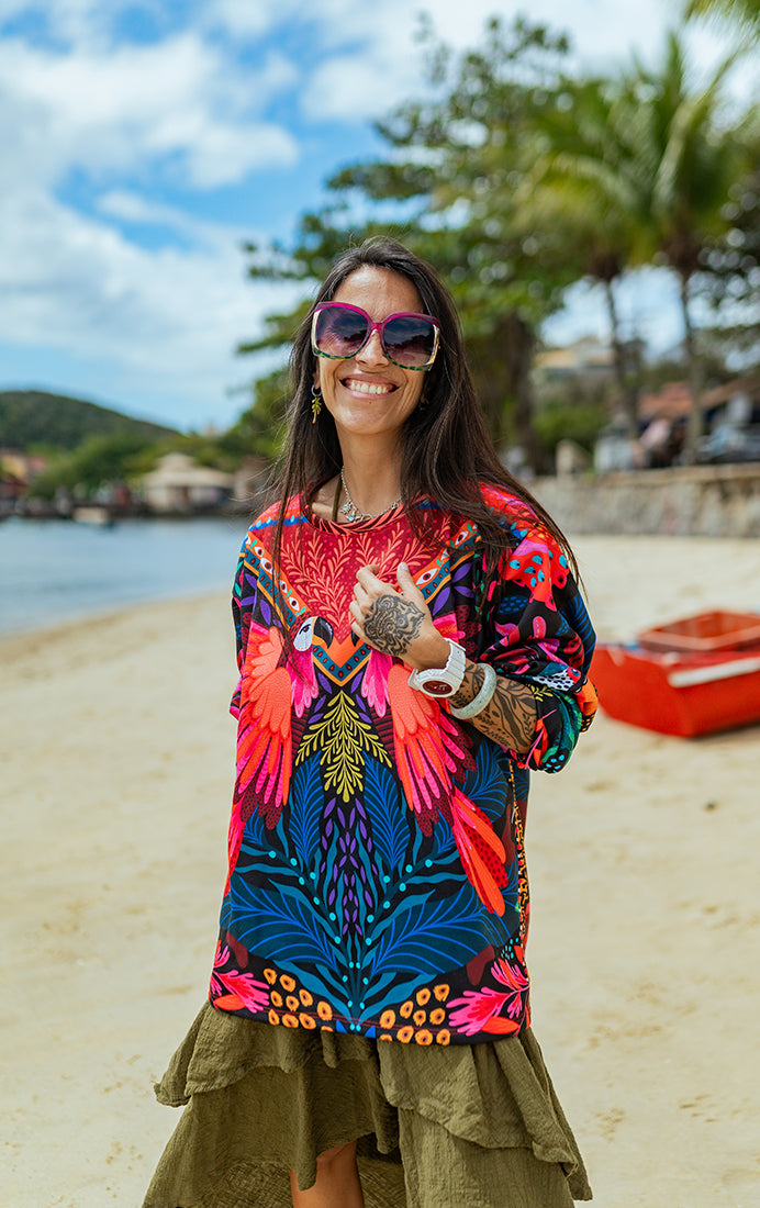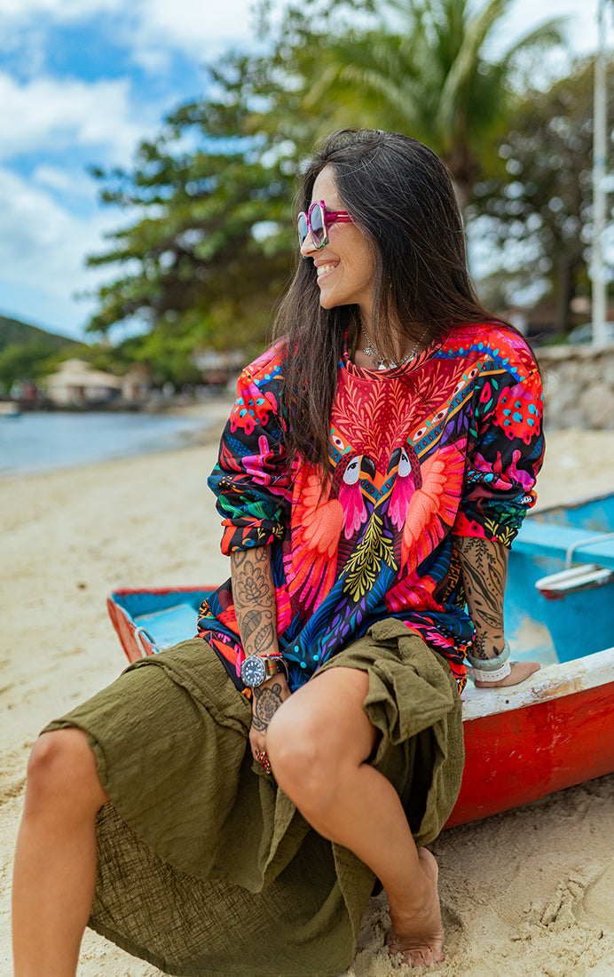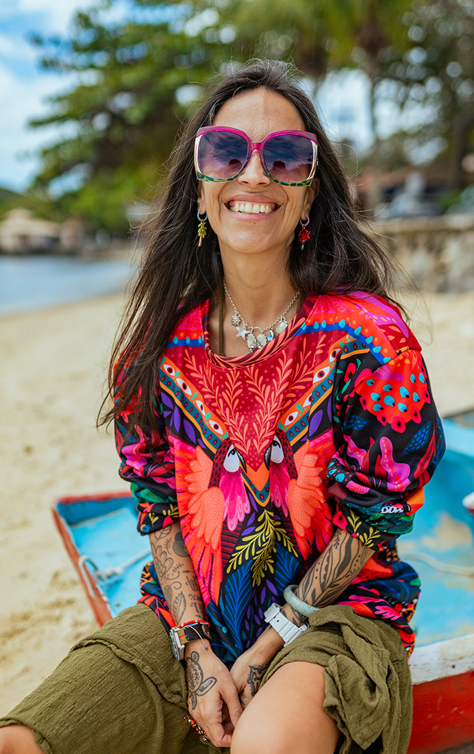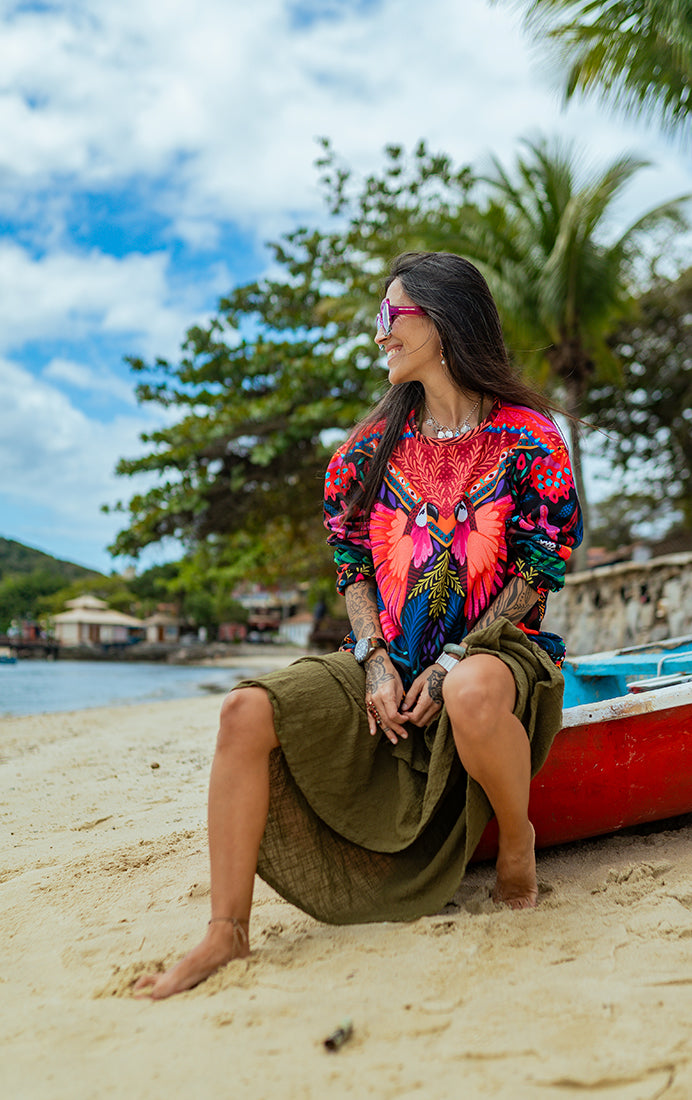 Con su cuello ancho y diseño relajado, es ideal para esas tardes en que refresca: en la playa, en el campo o en la ciudad. Perfecto para las medias estaciones, te acompañará con estilo, alegría y un toque único de color que te hará destacar en cualquier lugar.