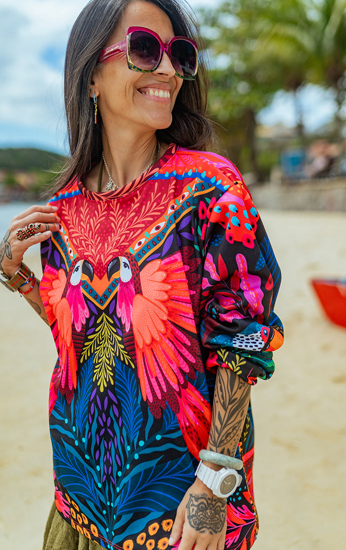 Este polerón de franela es la mezcla perfecta entre comodidad, suavidad y arte. Su interior es extremadamente suave, pensado para envolverte con calidez, mientras que su exterior estalla en colores gracias a una ilustración exclusiva de papagayos vibrantes, que lo transforma en una verdadera obra de arte en movimiento.
