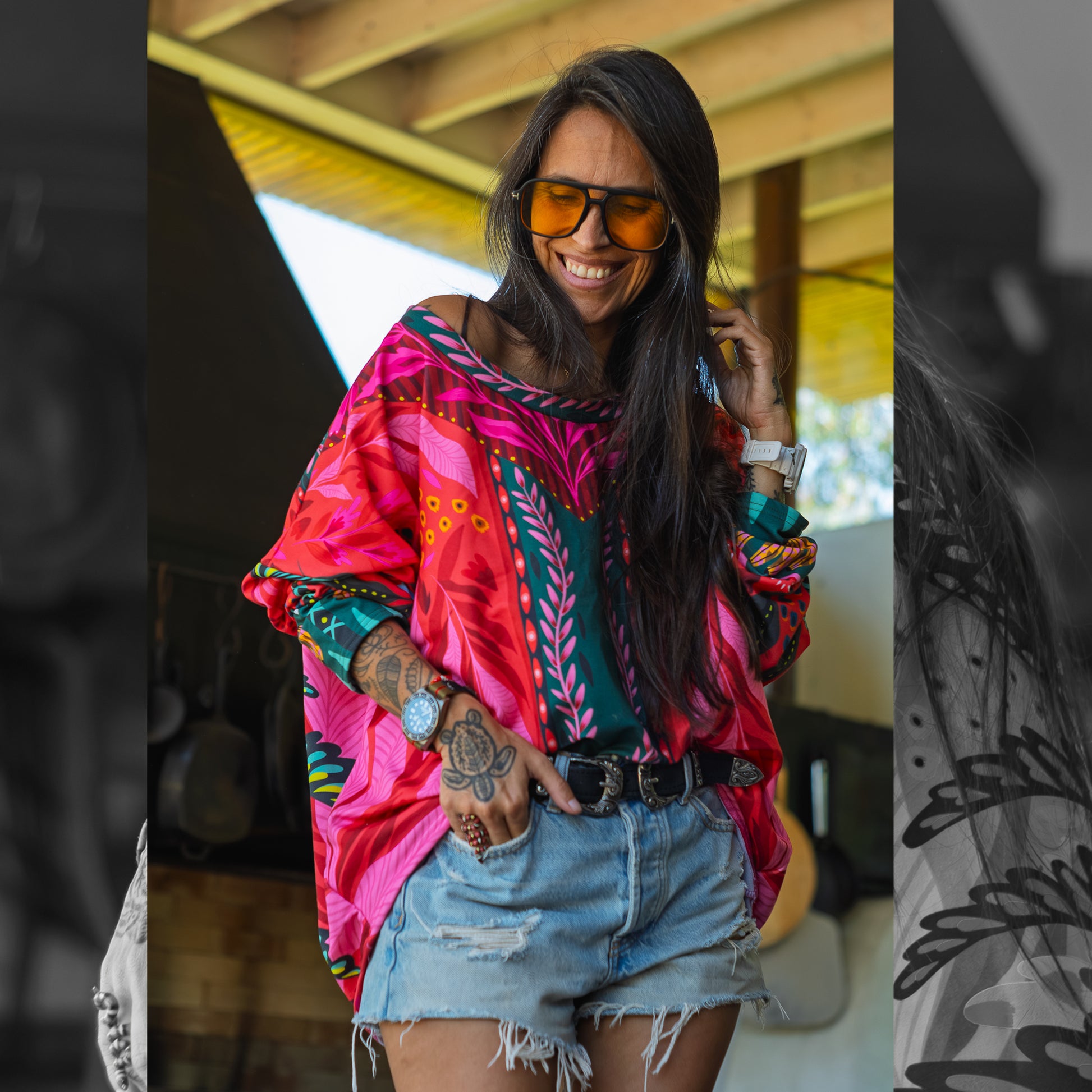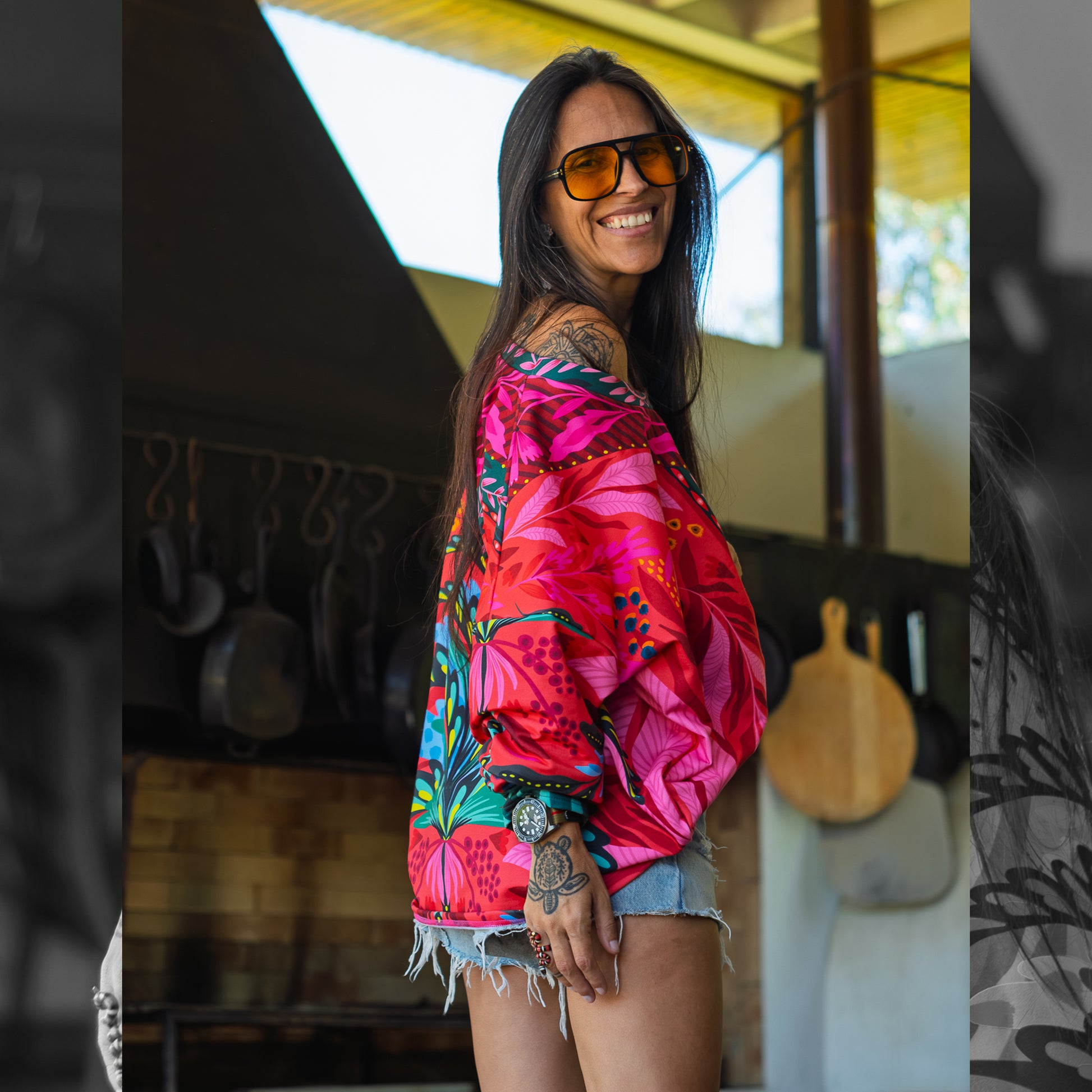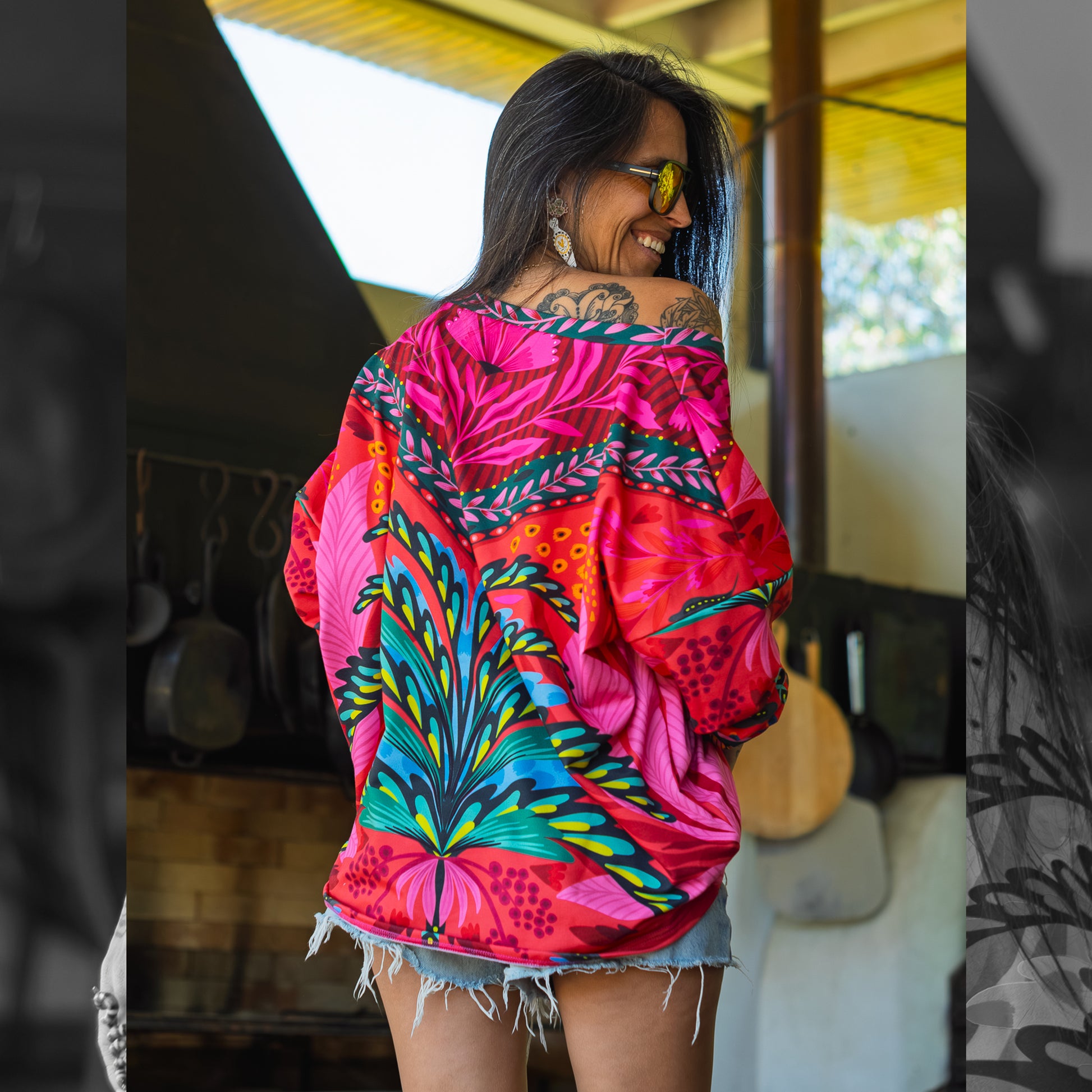 Está completamente ilustrado, lleno de vida y personalidad, como una verdadera obra de arte para vestir. Su tela suave y liviana lo hace ideal para la media estación o esas tardes veraniegas en que el sol se esconde y el aire refresca.