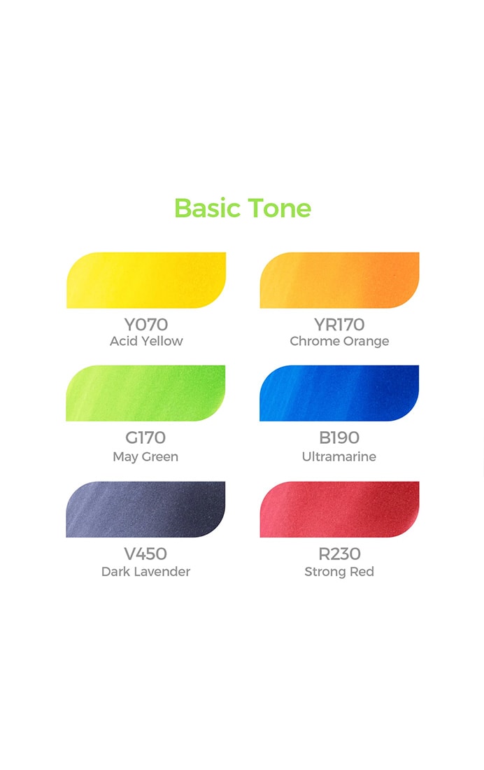 6 colores vibrantes: Y070 Amarillo ácido, YR170 Naranja cromo, G170 Verde mayo, B190 Ultramar, V450 Lavanda oscuro, R230 Rojo fuerte