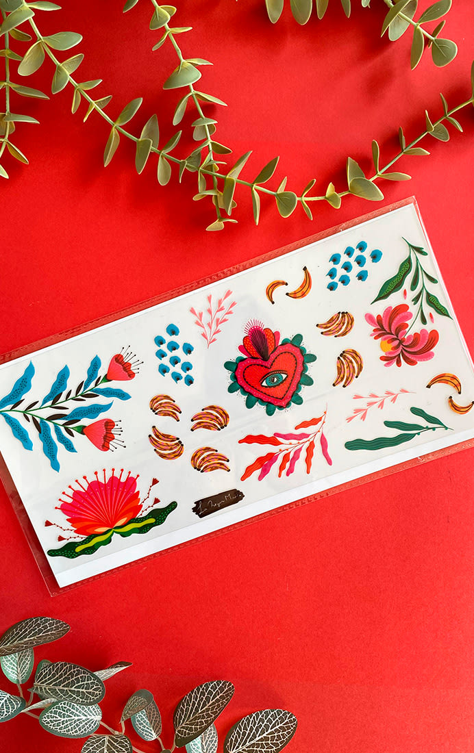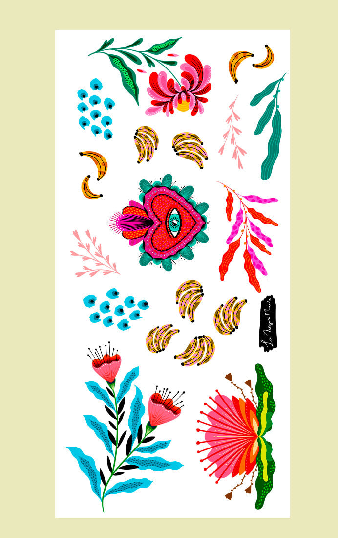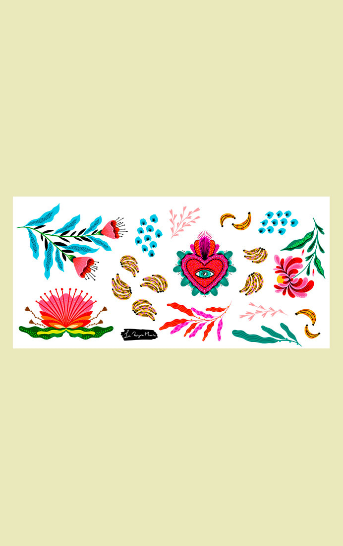 La lámina mide 29 x 13 cm y viene con varias ilustraciones exclusivas de La Negra María, que puedes recortar, combinar y pegar como quieras. Cada set es una invitación a jugar y crear tu propia composición sobre cualquier objeto liso.