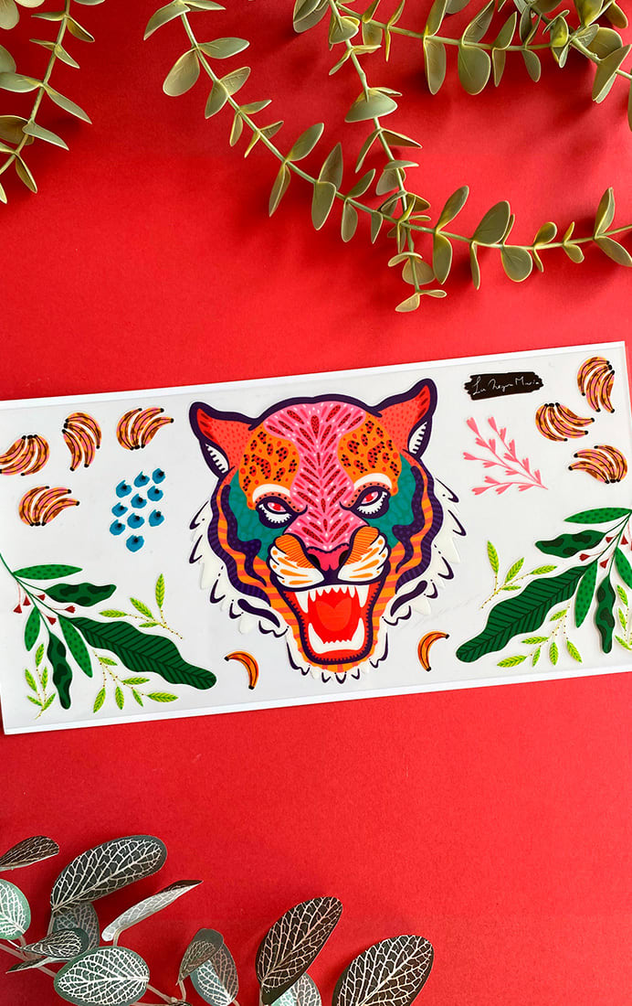 La lámina mide 29 x 13 cm y viene con varias ilustraciones exclusivas de La Negra María, que puedes recortar, combinar y pegar como quieras. Cada set es una invitación a jugar y crear tu propia composición sobre cualquier objeto liso.
