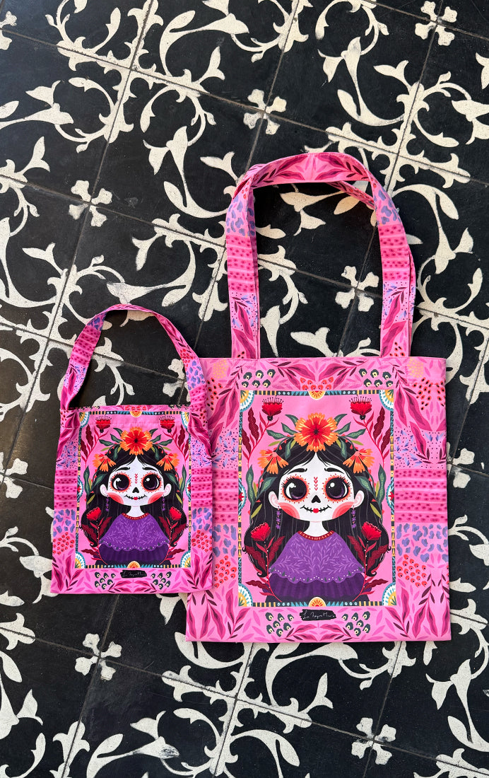Nuestra Tote Catrina está completamente ilustrada por ambas caras: en una, una maravillosa Catrina que rinde homenaje a la fiesta del Día de Muertos, y en la otra, una explosión floral llena de energía, alegría y feminidad.
