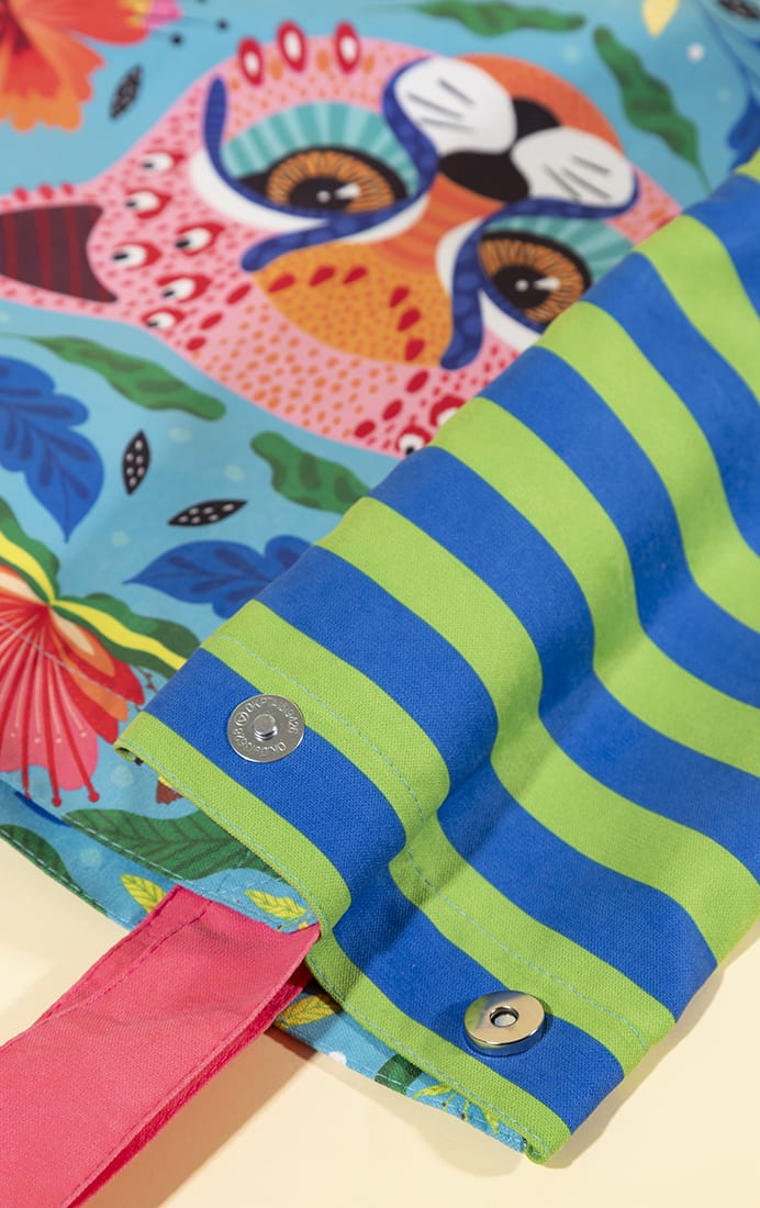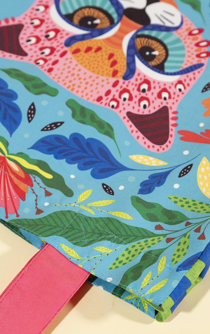 Está hecha de tela resistente y con un diseño exclusivo que refleja toda la pasión y color de mi arte, es perfecta para llevar lo que quieras: desde tus libros favoritos, lápices, mantitas y hasta las compras del día. Su amplio espacio te permitirá tener todo a mano, con algo de mi acompañándote en cada paso.